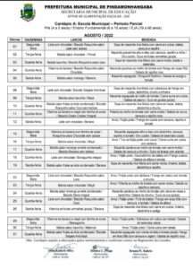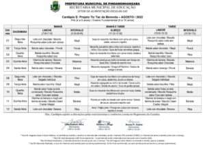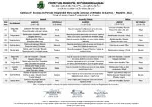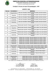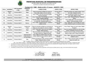 Cardápio A Parcial – Agosto 2022 Cardápio B1 – Agosto 2022 Cardápio B2 – Agosto 2022 Cardápio B3 – Agosto 2022 Cardápio D – Agosto 2022 Cardápio E Projeto Tic Tac – Agosto 2022 Cardápio F Integral – Agosto 2022