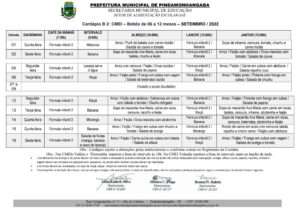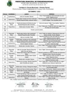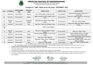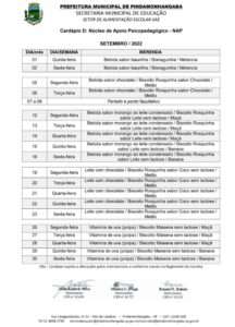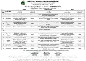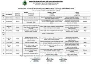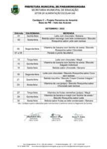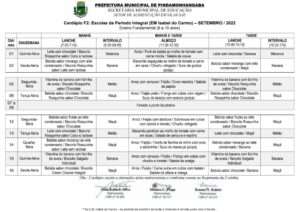 Cardápio A Parcial – Setembro 2022 Cardápio B1 – Setembro 2022 Cardápio B2 – Setembro 2022 Cardápio B3 – Setembro 2022 Cardápio C – Setembro 2022 Cardápio D – Setembro 2022 Cardápio E Projeto Tic Tac – Setembro 2022 Cardápio F1 Integral – Setembro 2022 Cardápio F2 – Setembro 2022