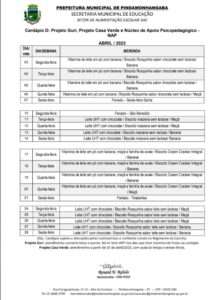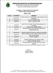 Cardápio A Parcial – Abril 2023 Cardápio B1 – Abril 2023 Cardápio B2 – Abril 2023 Cardápio B3 – Abril 2023 Cardápio C Integral – Abril 2023 Cardápio C Integral Segunda Sem Carne – Abril 2023 Cardápio D – Abril 2023 Cardápio E – Abril 2023