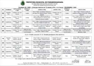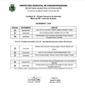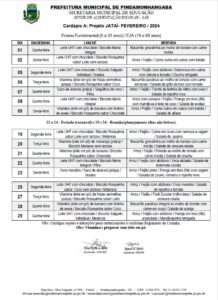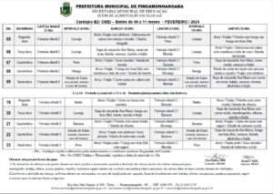 Cardápio A Projeto JATAI – Fevereiro 2024 Cardápio A Parcial – Fevereiro 2024 Cardápio B1 – Fevereiro 2024 Cardápio B2 – Fevereiro 2024 Cardapio B3 – Fevereiro 2024 Cardápio C Integral Ribeirão – Fevereiro 2024 Cardápio C Integral – Fevereiro 2024 Cardápio D – Fevereiro 2024 Cardápio E – Fevereiro 2024