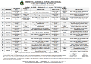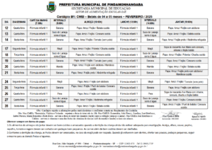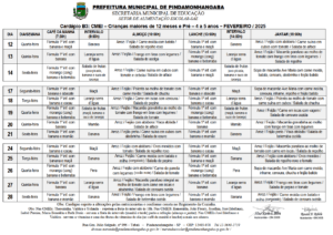 Cardápio A Parcial – Fevereiro 2025 Cardápio B1 – Fevereiro 2025 Cardápio B2 – Fevereiro 2025 Cardápio B3 – Fevereiro 2025 Cardápio C Integral – Fevereiro 2025
