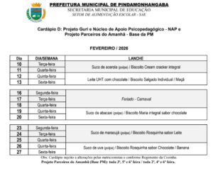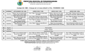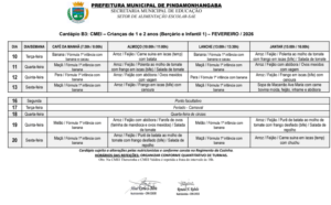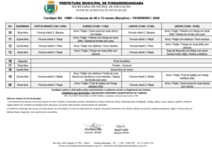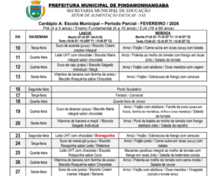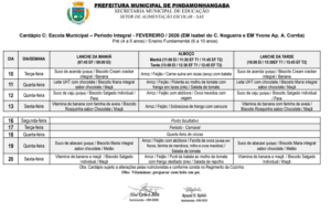 Cardápio A Parcial – Fevereiro 2026 Cardápio B1 – Fevereiro 2026 Cardápio B2 – Fevereiro 2026 Cardápio B3 – Fevereiro 2026 Cardápio B4 – Fevereiro 2026 Cardápio C Integral – Fevereiro 2026 Cardápio D – Fevereiro 2026