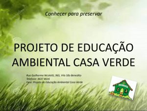 Diretrizes Projeto de Educação Ambiental Casa Verde Apresentação do Projeto Casa Verde Casa Verde Contra a Dengue Apresentação do Projeto Ambiental "Casa Verde" Casa Verde em ação - Cuidados com o lixo Consumo X Consumismo Xô Dengue! Vamos falar sobre separação do lixo. Plante na sua Casa! Dia Mundial do Meio Ambiente Desafio do Plantar! A Casa Verde apresenta: Duva no #Desafiodoplantar Reciclagem do Resíduo Doméstico Casa e Verde e Programa Aula Extra Compostagem com Ana Carrero no #DesafiodoPlantar Receitas Saudáveis Casa Verde apoia a Campanha "Julho sem plástico" Não às Queimadas! Biomas brasileiros "Mata Atlântica" Apresentação "Parque Natural Municipal do Trabiju" A Flora do Trabiju A fauna do Parque Natural Municipal do Trabiju Dia da Árvore Cuidados com os pets Animais Silvestres A importância das Abelhas Melhores Práticas 2020 Dispersão de sementes - FORMIGAS Água, energia e impactos ambientais. Manguezal - Equipe Casa Verde Chuva Ácida Oficina de Natal: árvore de Natal feita de material reutilizável Oficina de Natal 2 - Árvore e Boneco de espiral