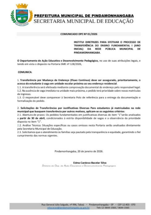 COMUNICADO DPE nº 01/2026 – Diretrizes para o Processo de Transferência do Ensino Fundamental I