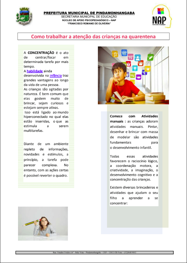 Diretrizes Orientações Psicológicas na Pandemia Dicas Fonoaudiológicas na Pandemia A Atividade de brincar como estimulação global da criança A vida ocorre fora das telas! Aprenda a contar histórias para as crianças e ensine-as a contar histórias também Procure o caminho Cantigas de roda do folclore brasileiro Como trabalhar a atenção das crianças na quarentena Consciência Fonológica Disfonia Infantil Fonoaudiologia & Disfunção da Integração Sensorial Ensinando valores e virtudes às crianças através de animais de estimação e plantas Escolha e Esperança! #MENOS TELAS #MAIS SAÚDE Meditação para crianças Fonoaudiologia: pistas multisensoriais e terapia da Fala Quais são os sintomas do autismo leve? Estímulos Pedagógicos na Pandemia Transtornos: Educação e Reflexão Projeto Piloto: Habilidades Cognitivo-Linguísticas Catálogo de Estimulação Cognitiva O jogo como recurso para a aprendizagem SETEMBRO AZUL FAH LEMOS
